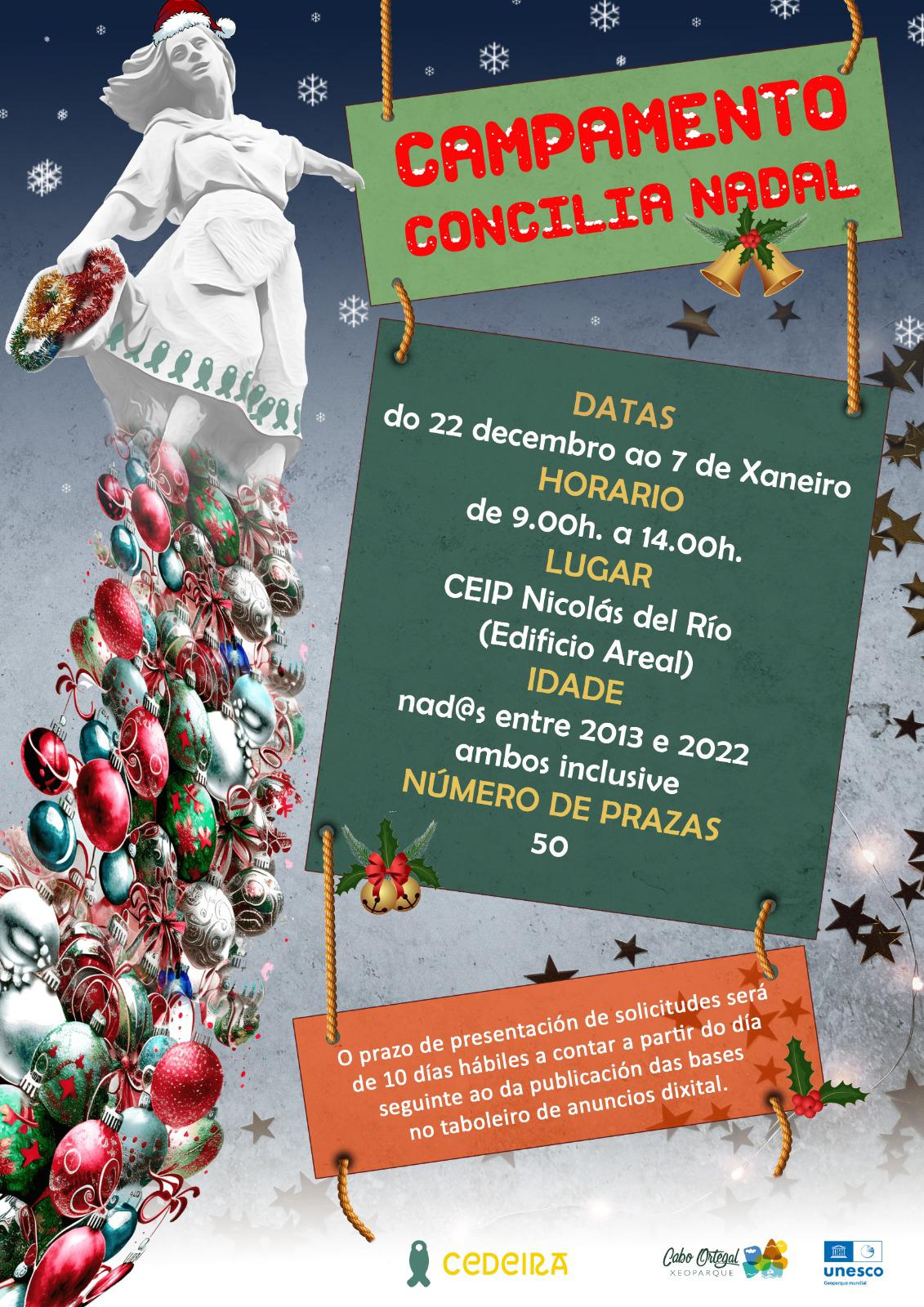O Concello de Cedeira porá en marcha o campamento urbano “Concilia Nadal” para que as familias poidan compatibilizar obrigas laborais e vacacións escolares durante as vindeiras festas. Hai 50 prazas para nenos e nenas nados entre 2012 e 2021, ambos incluídos, e o prazo de solicitude está aberto ata o día 9 de decembro. Como en anos anteriores, o campamento desenvolverase nas instalacións do CEIP Nicolás do Río en horario de mañás, de 09.00 a 14.00h, de luns a venres.