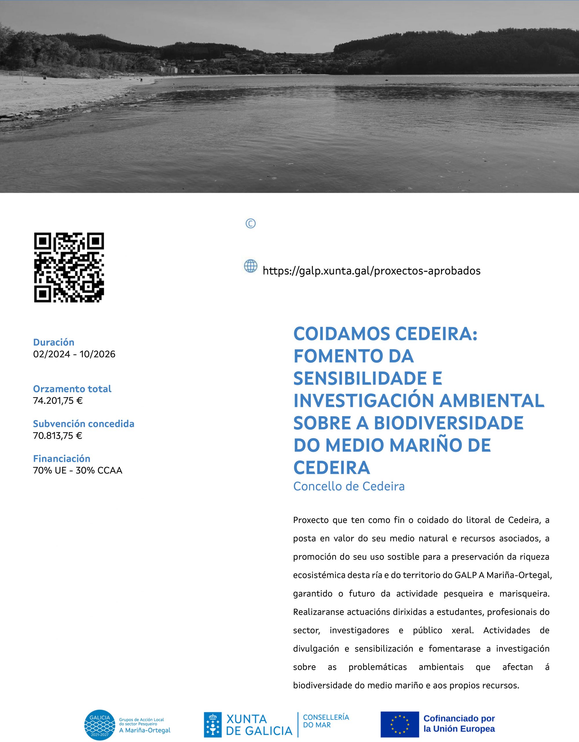 «Coidamos Cedeira» é unha iniciativa promovida polo Concello de Cedeira, presentada á convocatoria de 2024 para a obtención das axudas no marco do Fondo Europeo Marítimo, de Pesca e de Acuicultura, xestionadas polo GALP a Mariña – Ortegal.