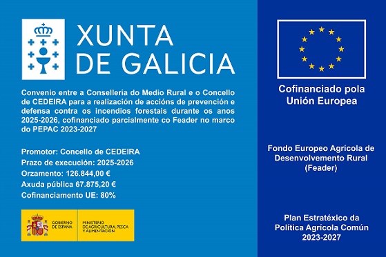 CONVENIO ENTRE A CONSELLERÍA DO MEDIO RURAL E A ENTIDADE LOCAL, CONCELLO DE CEDEIRA, PARA A REALIZACIÓN DE ACCIÓNS DE PREVENCIÓN E DEFENSA CONTRA OS INCENDIOS FORESTAIS DURANTE OS ANOS 2025-2026, COFINANCIADO PARCIALMENTE CO FONDO EUROPEO AGRÍCOLA DE DESENVOLVEMENTO RURAL (FEADER) NO MARCO DO PLAN ESTRATÉXICO DA POLÍTICA AGRARIA COMÚN (PEPAC) 2023-2027