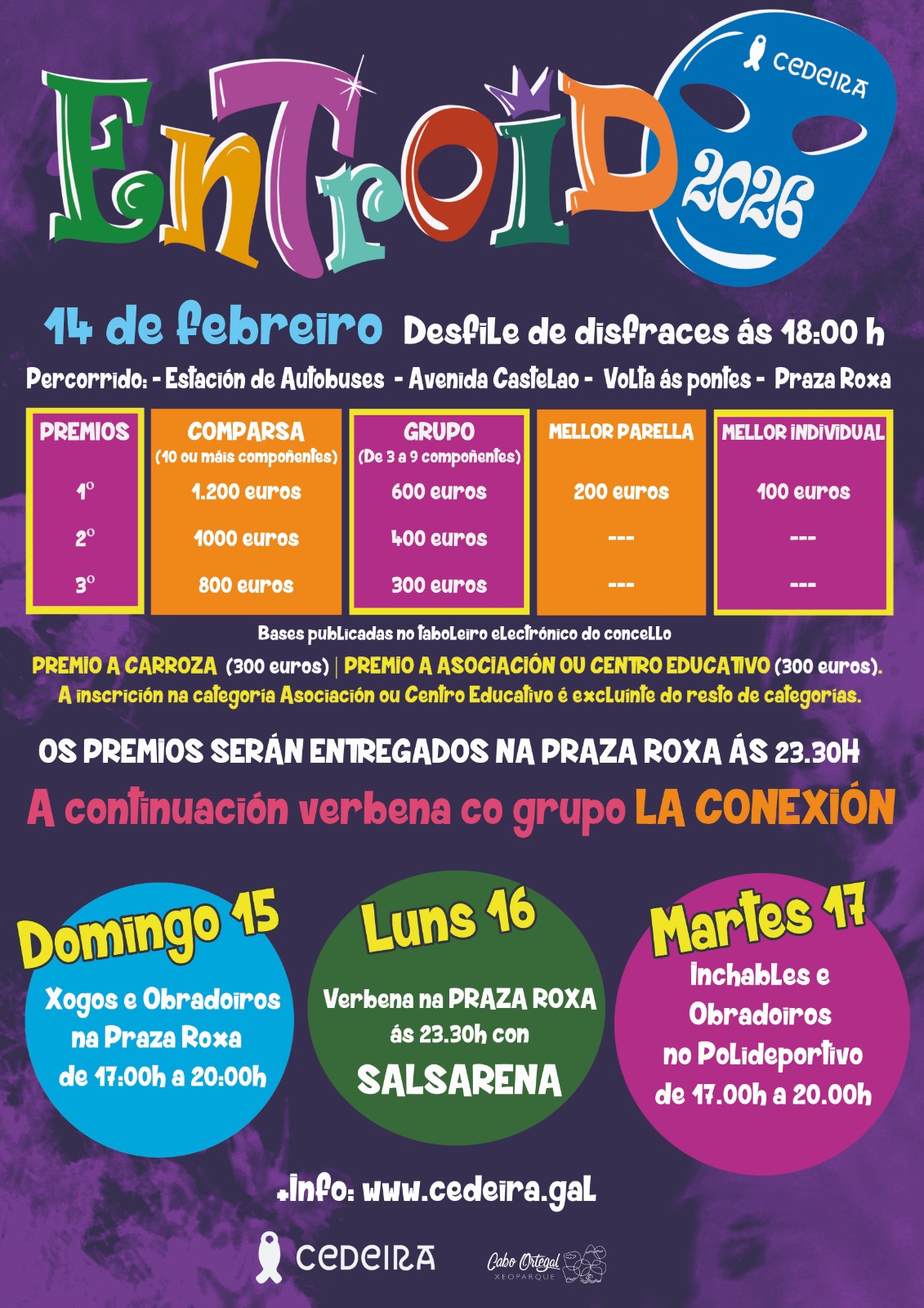 O Concello de Cedeira publicou xa as bases do concurso de disfraces que convoca un ano máis para o Entroido. O desfile será o sábado 14 de febreiro, a partir das 18.00h, e xa está aberto o prazo para que as persoas que queiran participar realicen a súa inscrición nas categorías individual, parella, asociación ou centro educativo, grupos, comparsas e carrozas. Por terceiro ano consecutivo desde que se incrementou a dotación dos premios, repartiranse un total de 5.200€ entre os mellores de cada modalidade.