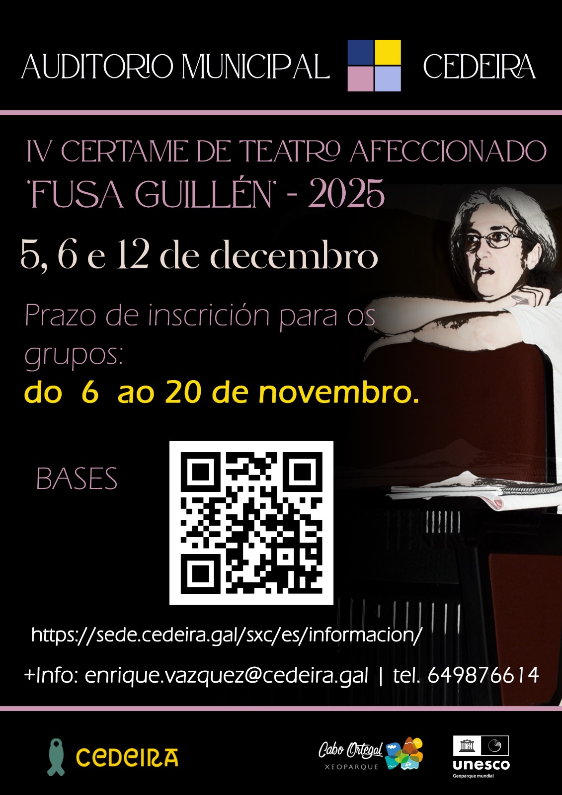 O Concello de Cedeira convoca a cuarta edición do Certame de Teatro Afeccionado Fusa Guillén, unha iniciativa coa que promociona a actividade das compañías non profesionais ao tempo que rende homenaxe e mantén viva na memoria a unha muller que deixou fonda pegada na vida cultural e que, particularmente, contribuiu a impulsar o teatro na localidade. Ata o vindeiro 20 de novembro, os grupos de teatro amador que o desexen poden presentar as súas candidaturas.