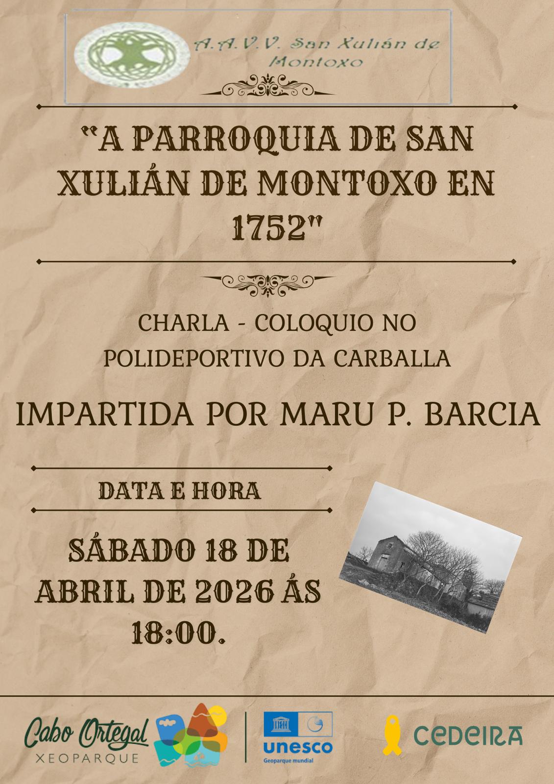 A La.V.V. San Xulián de Montoxo organiza una charla-coloquio sobre la parroquia de San Xulián de Montoxo en el año 1752. La actividad tendrá lugar en el polideportivo de la Carballeira y será impartida por Maru P. Barcia.