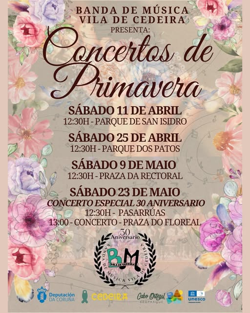 O ciclo pecharase o sábado 23 de maio cun concerto especial polo 30 aniversario da Banda de Música Vila de Cedeira, cun pasarrúas ás 12:30 h e concerto final ás 13:00 h na Praza do Floreal.