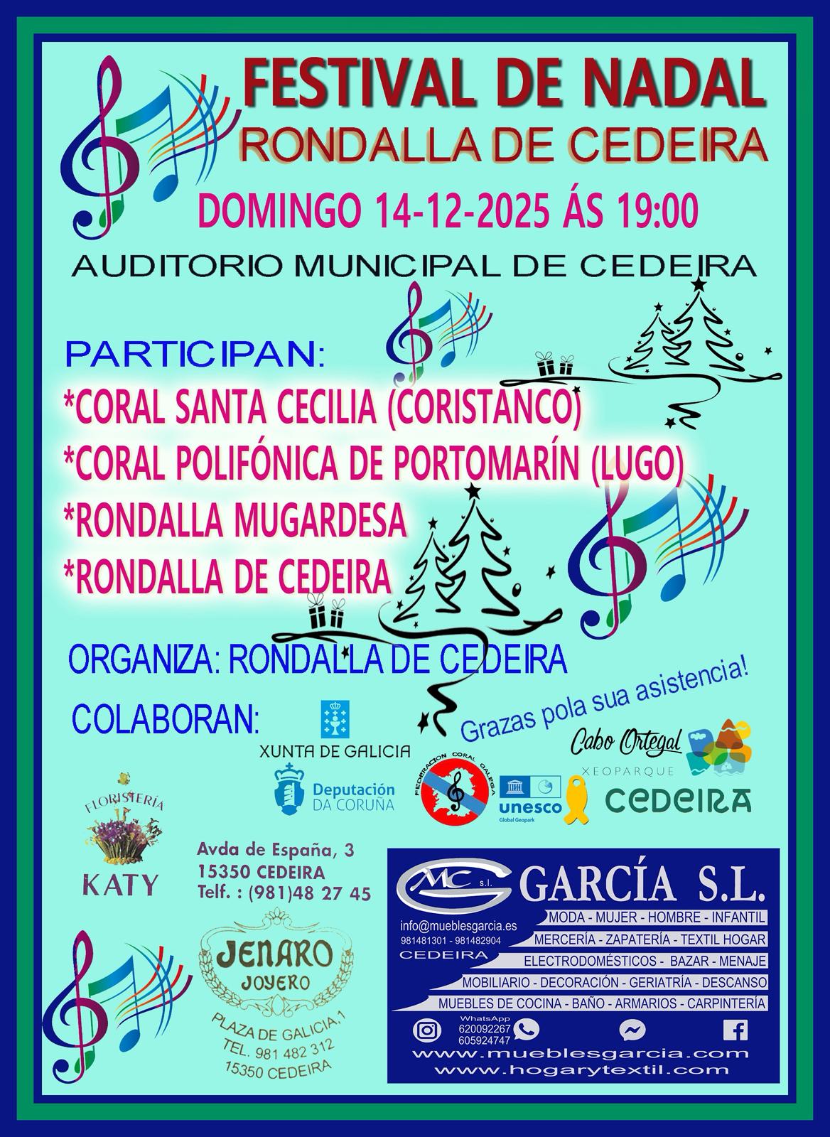 O vindeiro domingo 14 de decembro de 2025, ás 19:00 horas, celebrarase no Auditorio Municipal de Cedeira o tradicional Festival de Nadal da Rondalla de Cedeira, unha cita musical destacada da programación cultural deste mes.