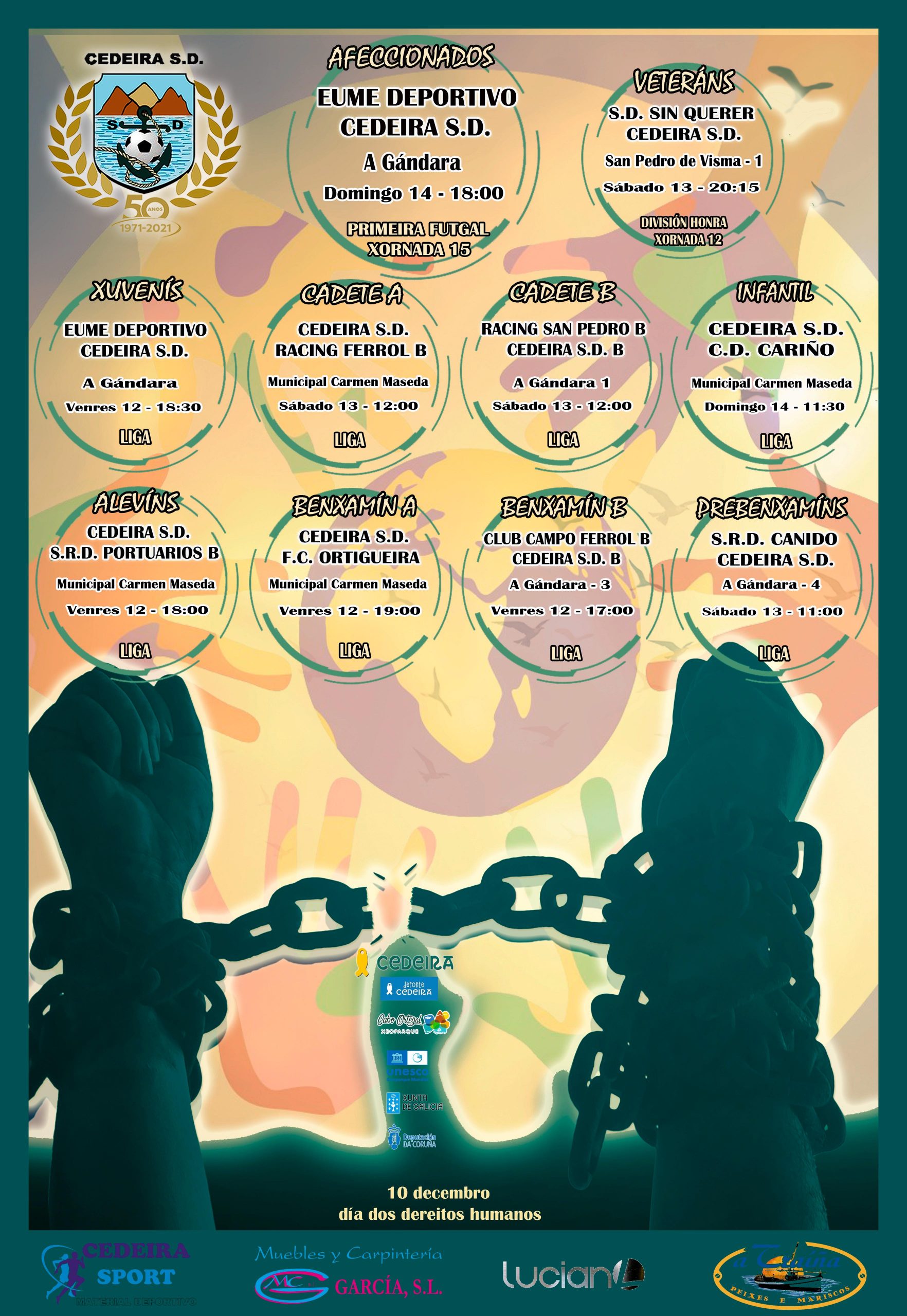 O Cedeira S.D. presenta a programación deportiva da fin de semana con encontros para todas as categorías, desde afeccionados ata prebenxamíns. Os partidos disputaranse entre os días 12 de decembro e 14 de decembro, nos campos da Gándara e no Municipal Carmen Maseda.