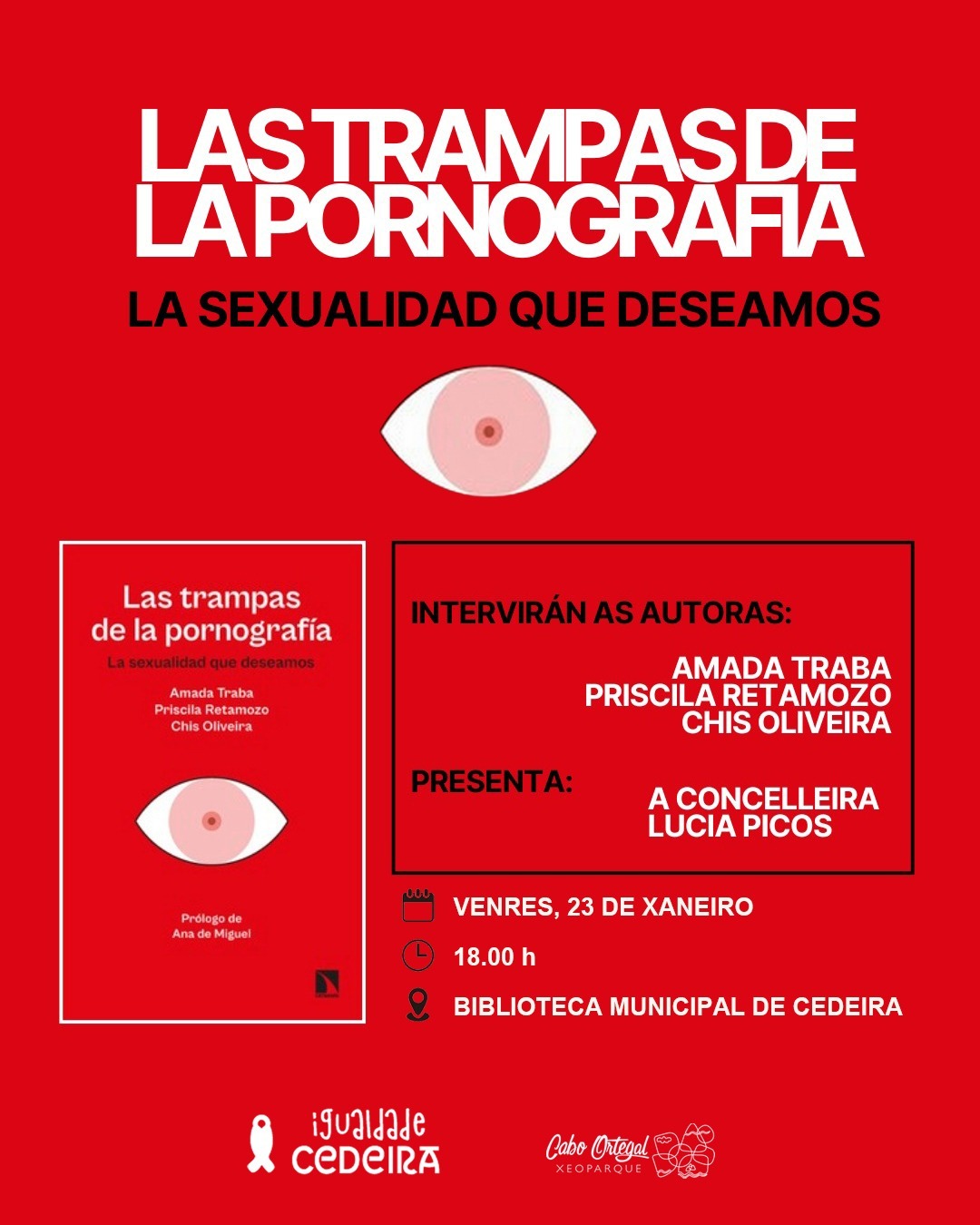 Amada Traba, licenciada en Ciencias Políticas e socióloga; Priscila Retomazo, Máster en igualdade de xénero, e Chis Oliveira, Catedrática de Filosofía e doutora en educación afectivo sexual, veñen a presentarnos o seu novo libro ” LAS TRAMPAS DE LA PORNOGRAFÍA”, que convida a pensar, a ollar diferente, a incomodarnos se é preciso, pero sobre todo, a achegarnos ao que queremos construír: unha educación afectivo-sexual libre, crítica, consciente e feminista.