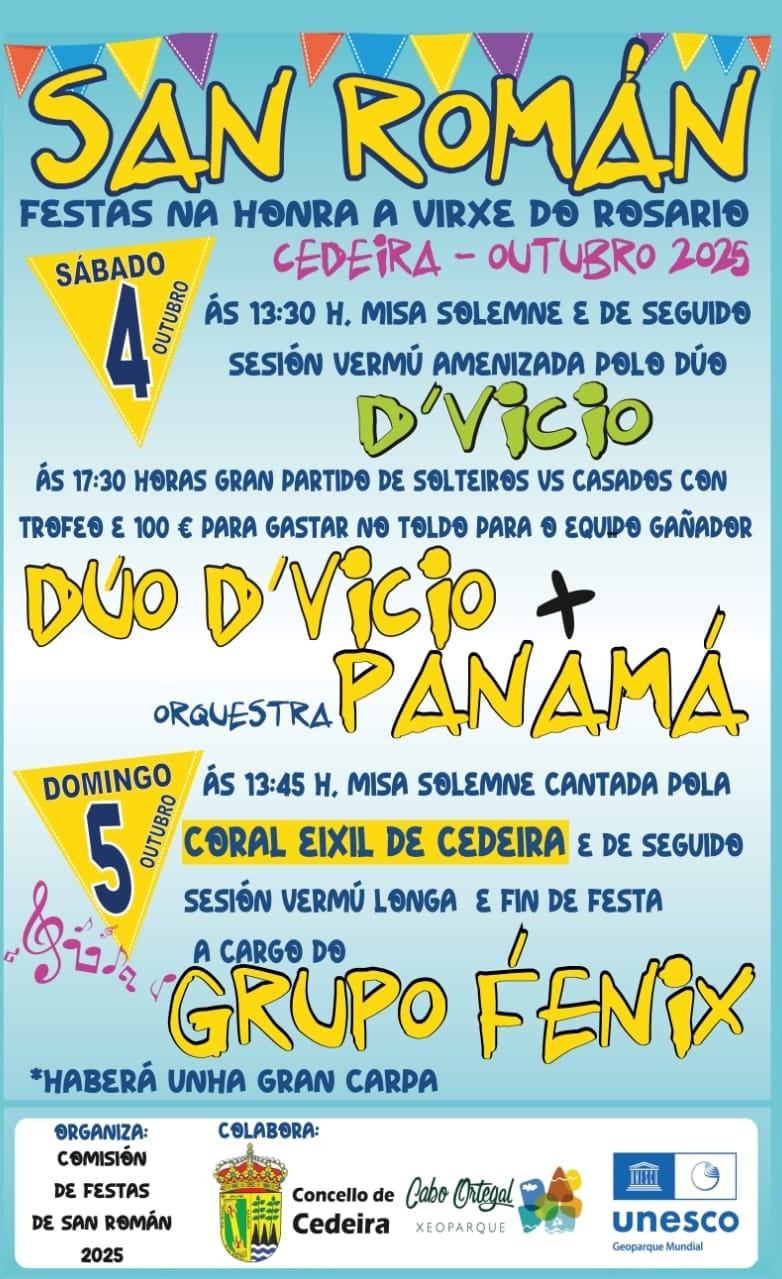 Domingo 5 de outubro ás 13.5h misa solemne cantada pola Coral Eixil de Cedeira e de seguido sesión vermú longa e fin de festa a cargo do Grupo Fénix.