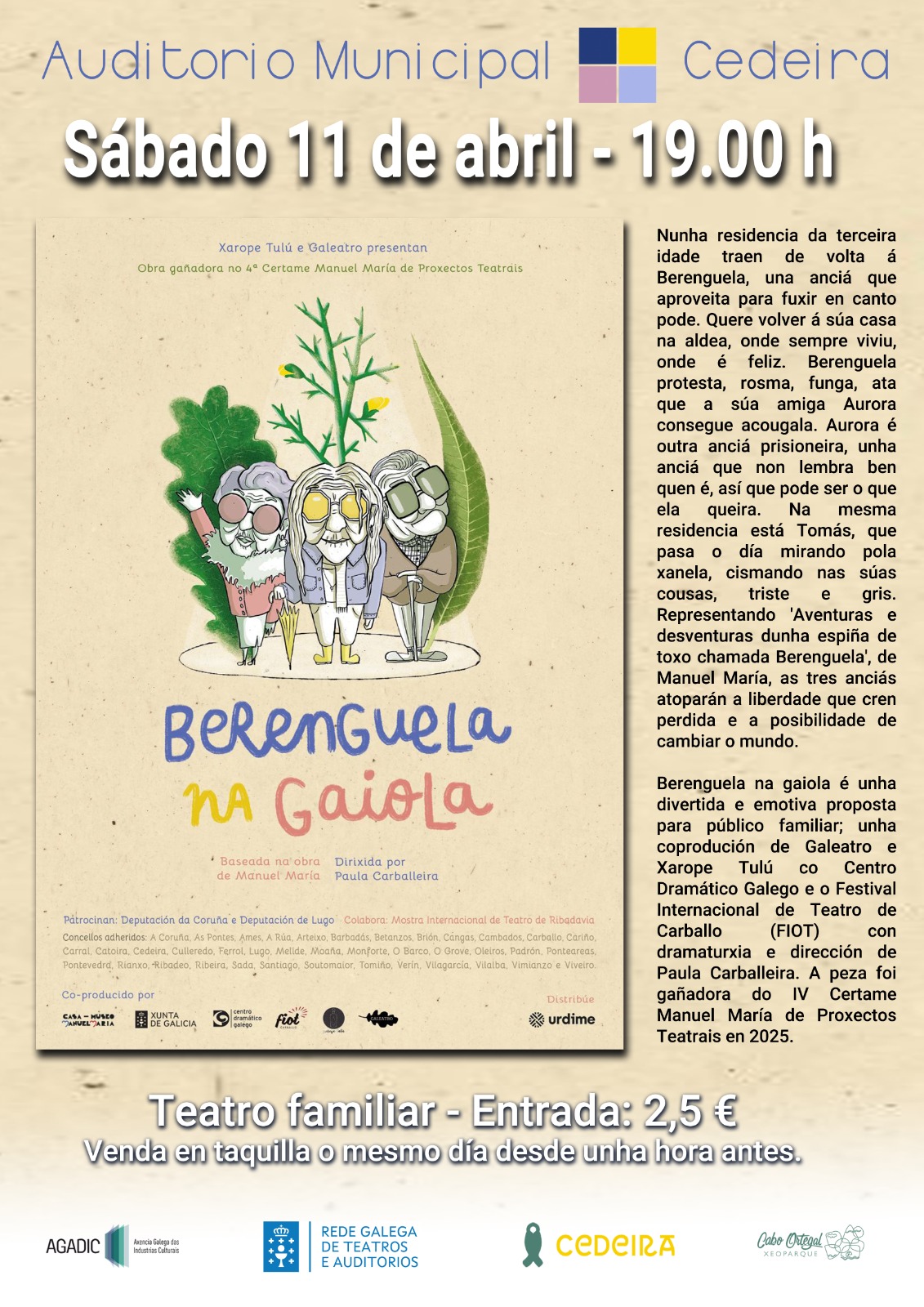 Berenguela na gaiola é unha divertida e emotiva proposta para público familiar; unha coprodución de Galeatro e Xarope Tulú co Centro Dramático Galego e o Festival Internacional de Teatro de Carballo (FIOT) con dramaturxia e dirección de Paula Carballeira. A peza foi gañadora do IV Certame Manuel María de Proxectos Teatrais en 2025.