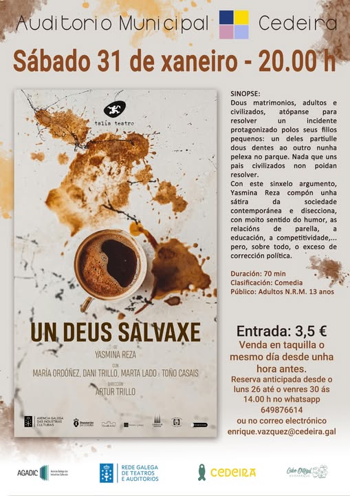 Sábado 31 coa representación de “Un deus salvaxe”, peza de Yasmina Reza, por parte de Talía Teatro. Ás 20.00h no Auditorio Municipal.