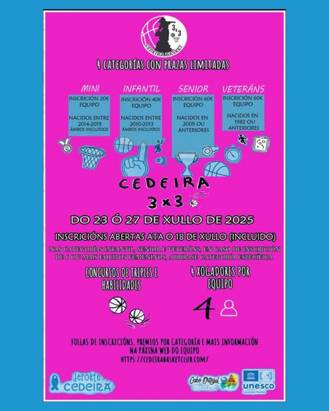 O Cedeira Basket Club celebra unha nova edición do torneo 3×3 de baloncesto. As inscricións estarán abertas ata o 18 de xullo.