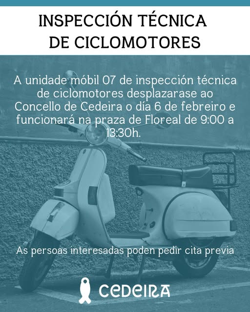 A Unidade Móbil 07 de inspección técnica de ciclomotores desplazarase ao Concello de Cedeira o 6 de febreiro de 2026 e estará estacionada na Plaza Floreal.