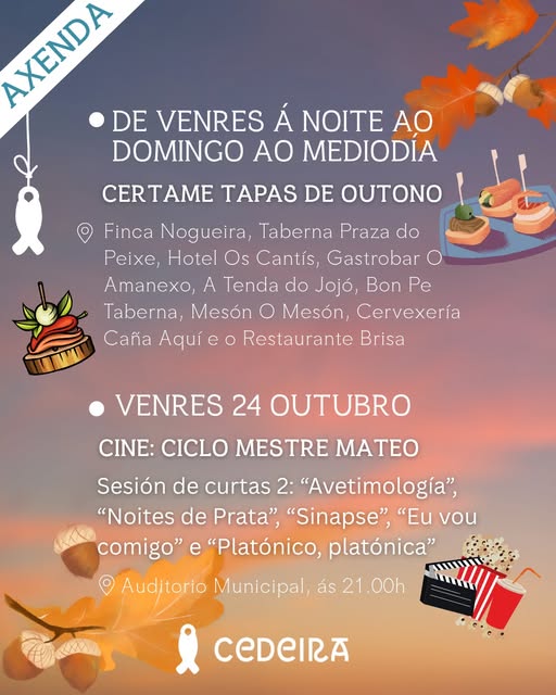 Desenvolverase tamén a sexta edición do certame “Tapas de Outono”, no que se servirán petiscos a 3€ en nove establecementos da localidade. Finca Nogueira, Taberna Praza do Peixe, Hotel Os Cantís, Gastrobar O Amanexo, A Tenda do Jojó, Bon Pe Taberna, Mesón O Mesón, Cervexería Caña Aquí e o Restaurante Brisa son os locais participantes e, segundo as bases, as tapas poderán degustarse venres á noite, sábado nos servizos de mediodía e noite, e domingo ao mediodía.