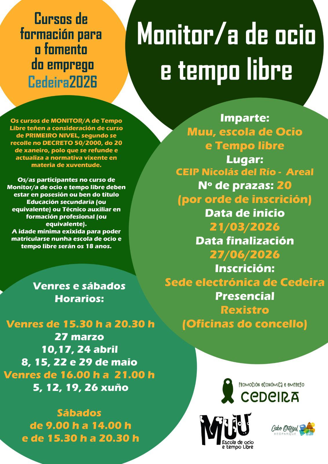 El Ayuntamiento de Cedeira organiza un curso de monitor/a de ocio y tiempo libre que proporcionará a quién lo complete el título de primero nivel reconocido y exigido por la Xunta de Galicia según el Decreto 50/2000 de 20 de enero en el que se refunde y actualiza la normativa en materia de Juventud. Para realizar el programa es preciso tener 18 años cumplidos y estar en posesión del título de la ESO, técnico auxiliar en FP o equivalente.