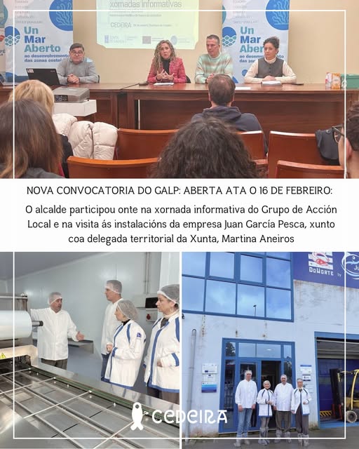 O alcalde de Cedeira, Pablo Diego Moreda Gil, participou onte na inauguración da xornada informativa que o Grupo de Acción Local do sector Pesqueiro (GALP) A Mariña-Ortegal desenvolveu nas instalacións da Confraría para difundir as oportunidades de financiamento que o tecido empresarial ten, especialmente o relacionado co mar, no programa de axudas do Fondo Europeo Marítimo de Pesca e Acuicultura (FEMPA) 2021-2027. O acto contou tamén coa presencia da delegada territorial da Xunta de Galicia, Marina Aneiros, coa que o alcalde acudiu a continuación a visitar a empresa Juan García Pesca SL, beneficiaria do programa e exemplo do seu impacto positivo.