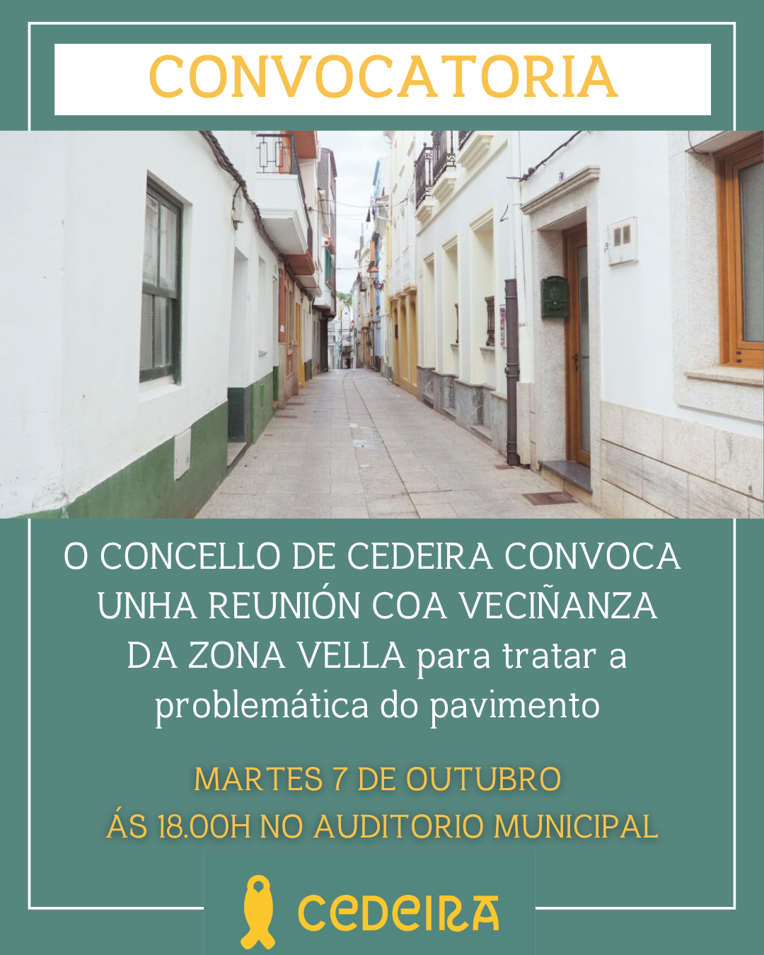 O Concello de Cedeira convoca a veciños e veciñas da zona vella da vila a unha reunión que terá lugar o vindeiro martes, 7 de outubro, ás 18.00h no Auditorio Municipal. O obxecto deste encontro é poder abordar a problemática que existe co pavimento e explicar as medidas que se están a tomar.