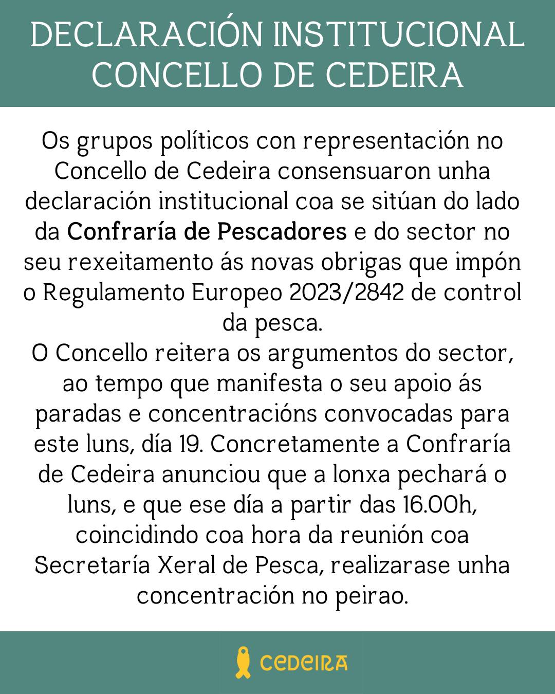 Os grupos políticos con representación no Concello de Cedeira acordaron facer unha declaración institucional en defensa do sector pesqueiro, situándose do lado da Confraría de Pescadores da localidade e o resto das entidades representativas do sector no seu rexeitamento ás novas obrigas que impón o Regulamento Europeo 2023/2842 de control da pesca. Neste comunicado reiteran os argumentos do sector afectado, ao tempo que queren manifestar o seu apoio ás paradas e concentracións convocadas para este luns, día 19.