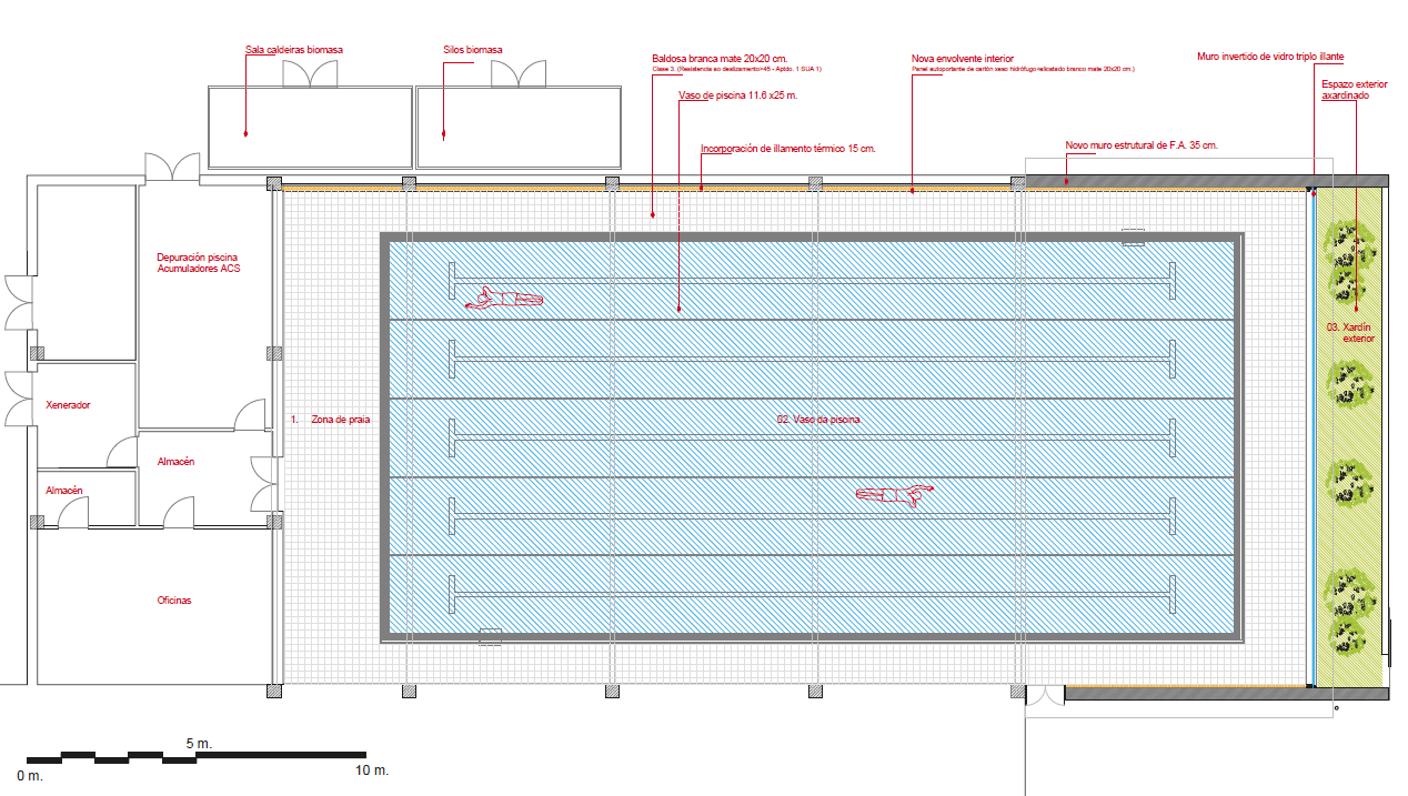 La piscina, de 16 metros de largo, va a crecer por la fachada este. El vaso actual, de 16,2×8,3m, pasará a tener 25×11,6m, y toda la instalación mejorará también en superficie playera y en la eficiencia energética. Se construirán nuevos muros que sustentarán una renovada cubierta y la fachada del lado este será de vidrio aislante, que permitirá el paso de la luz natural. La instalación tendrá también nuevos equipos de depuración de agua, renovación de aire e iluminación.