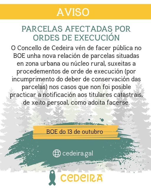 O Concello de Cedeira vén de facer pública no BOE unha nova relación de parcelas situadas en zona urbana ou núcleo rural, suxeitas a procedementos de orde de execución (por incumprimento do deber de conservación das parcelas) nos casos que non foi posible practicar a notificación aos titulares catastrais, de xeito persoal, como adoita facerse.