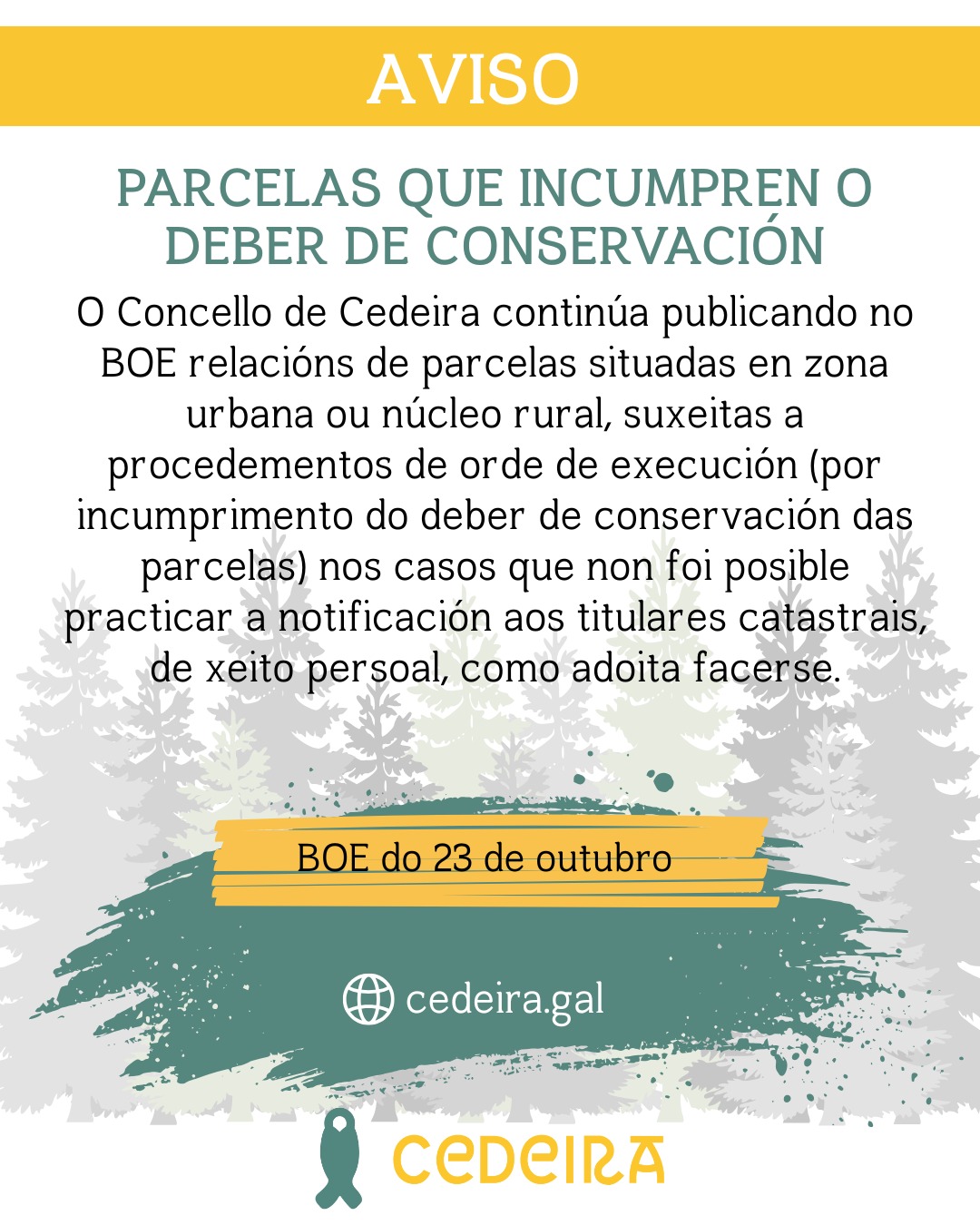O Concello de Cedeira continúa publicando no BOE relacións de parcelas situadas en zona urbana ou núcleo rural, suxeitas a procedementos de orde de execución (por incumprimento do deber de conservación das parcelas) nos casos que non foi posible practicar a notificación aos titulares catastrais, de xeito persoal, como adoita facerse.