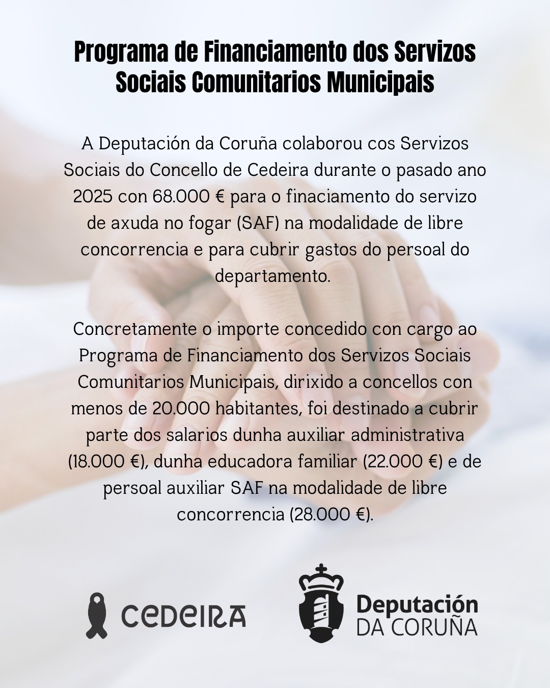 A Deputación da Coruña colaborou cos Servizos Sociais do Concello de Cedeira durante o pasado ano 2025 con 68.000 € para o financiamento do servizo de axuda no fogar (SAF) na modalidade de libre concorrencia e para cubrir gastos do persoal do departamento.