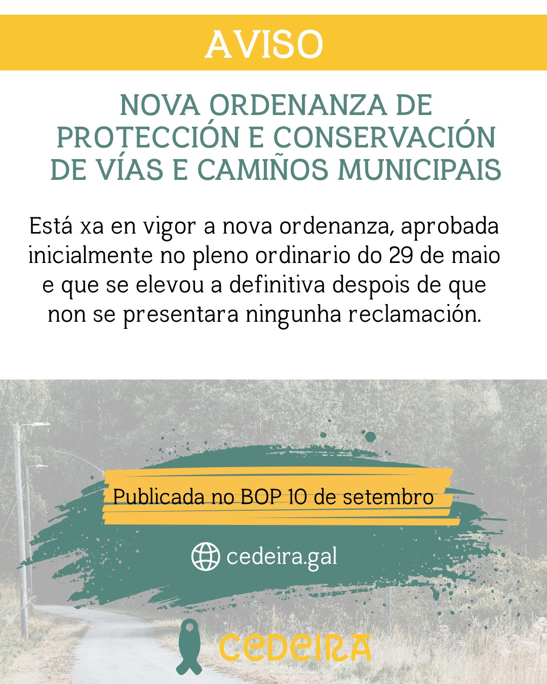 El Pleno del Ayuntamiento de Cedeira, en sesión común celebrada el día 29 de mayo de 2025, acordó la aprobación inicial de la Ordenanza de protección y conservación de vías y caminos municipales. @Dito acuerdo quedó automáticamente elevado a definitivo al no haberse presentado reclamaciones durante el período de exposición al público, entrando en vigor el pasado 1 de octubre de 2025.